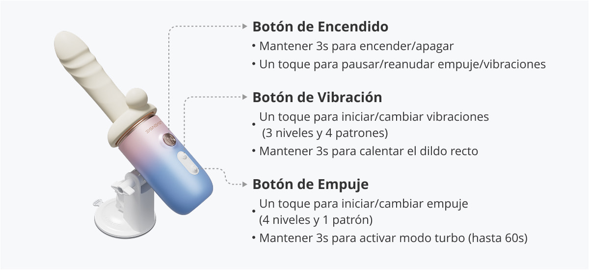 El Modo Turbo te permite disfrutar de hasta 1450 empujes por minuto. Asegúrate de estar usando el dildo recto, luego mantén presionado el botón de empuje durante 3 segundos. También puedes abrir la aplicación Lovense Remote y mantener presionada la bola de empuje en la parte superior del panel de control durante 3 segundos para desbloquear, luego simplemente desliza la bola a la sección "Modo Turbo" para activarlo.